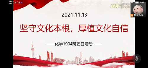 2021年11月13日晚上七点半,化学1904班组织的“坚守文化本根,厚植文化自信”主题团日活动于线上腾讯会议顺利开展。