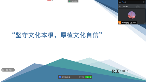 为学习贯彻“党的十九大精神”、新时期“两会精神”,认真领会“四个自信”,弘扬中华民族优秀传统文化,坚定树立文化自信,2021年11月15日晚九点整,化学工程与工艺1901班开展了以“坚守文化本根,厚植文化自信”为主题的团日活动。受疫情影响,本次团日活动以寝室为单位进行开展,通过腾讯会议进行线上交流,由团支书李媛媛同学负责策划并收集视频资料,各寝室长负责拍摄活动照片,化工1901班全员参与。