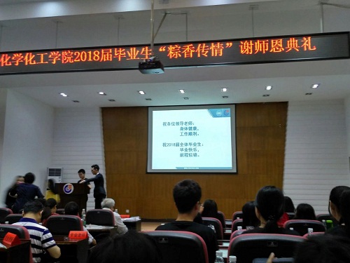 在“献师礼”仪式上,毕业生代表们向院领导和各位老师送上了同学们精心准备的礼物和鲜花;班级代表们饱含深情为老师们表演了诗朗诵。全场毕业生鞠躬感谢老师是最触动人心弦的环节,所有毕业生们在主持人指引下向关心教诲我们四年的各位最敬爱的老师三鞠躬,用这种最直接最传统的方式向老师们表达了谢意,一切尽在不言中!