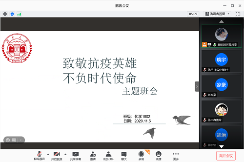 11月5日晚7时,球友会化学1802班通过腾讯会议,在线上开展了“致敬抗疫英雄,不负时代使命”主题班会。此次班会旨在宣扬抗疫精神,激励同学们肩负起新时代的使命。会议由班长顾悦主持,全体同学准时参加。