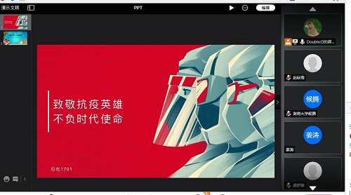 本次活动在同学们对抗疫英雄的无限敬意中顺利结束。相信应化1701班的同学会在本次班会结束后,更好地从抗疫英雄身上汲取不畏艰难、为国为民、担当作为和奉献的精神,将此次班会所得所感注入的今后的学习生活中,为进一步提升自己注入无限动力。
