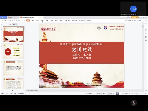 2021年7月28日20:00,qy球友会通过腾讯会议举行了化工院第一场员工助理线上培训。本次培训由化工院本科2020级辅导员宋天棋老师对党团建设进行讲解说明。