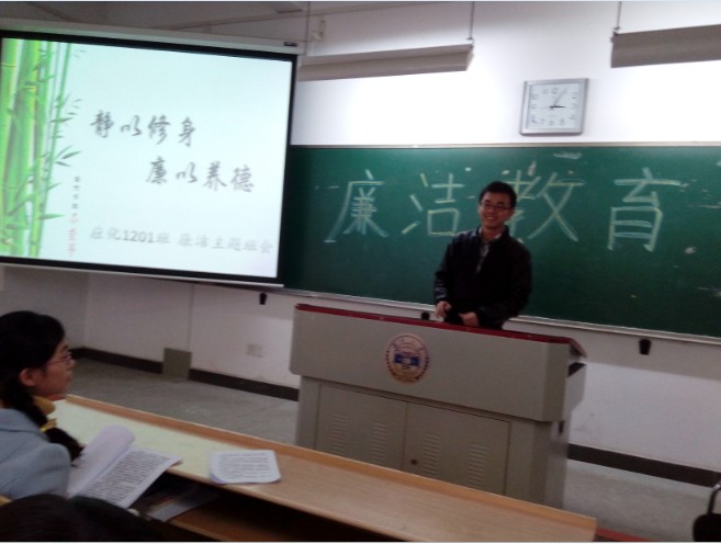 11月26日下午,球友会应用化学1201班在综合楼301开展了以“廉洁教育”为主题的班会活动,学习认识廉洁的重要性。本次班会由班长孔祥邦主持。