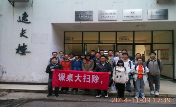 —— 2014年11月9日17:30,球友会青协的志愿者们再次带着他们的神奇药水,来到了逸夫楼,这是上周“课桌大扫除”的一个延续,这次活动旨在消除马克笔在地面和桌面上留下的痕迹,同时对逸夫楼报告厅进行全面清扫,为大家营造一个整洁舒适的环境。