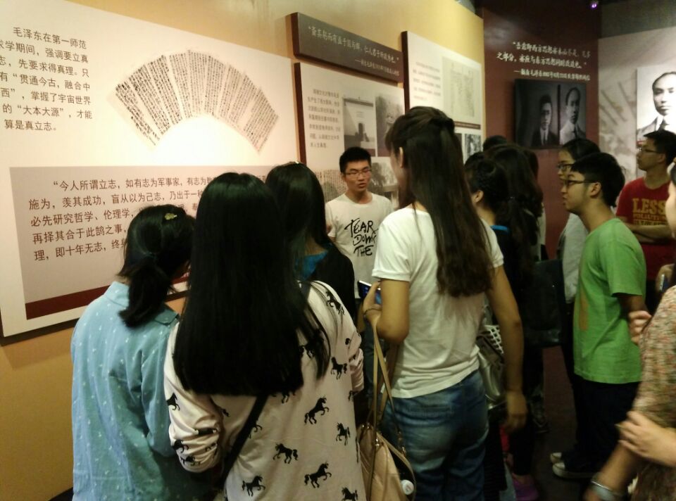 参观内容分为“走出乡关、求学师范”,“闹中求静、文明作风”,“游学之路、勇于实践”和“强健体魄”四个部分。分别由志愿解说的罗宇倩,刘新宇,余淑敏和赵磊负责为同学们解说。一张张饱含历史沧桑的照片,一件件深刻岁月痕迹的文物,一句句透着钦佩感慨的解说,向同学们讲述着毛泽东从小志存高远,求知若渴,从韶山冲里走出来,几经尝试,最终选择在师范公司学习的往事。余淑敏指点着湖南的地图说:“毛主席多次以游学的方式深入农村进行社会调查,借以了解社会学习书本上没有的东西。1917年他和同学历经千里行程,在长沙、宁乡、安化、益阳和沅江五县进行了调查。