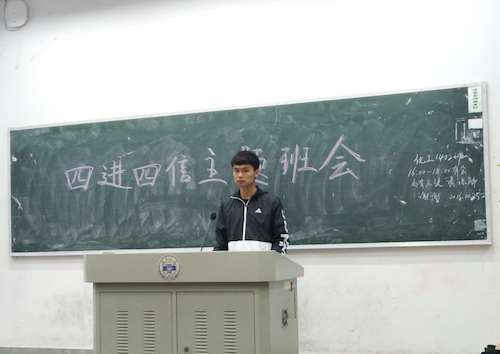 班会开始,刀旋同学为同学们介绍了“四进四信”提出的背景及主要内容,即以“四进”为手段,以“四信”为目标,通过“进支部、进社团、进网络、进团课”,组织开展有形化、经常化的工作和活动,引导帮助广大青年员工和高校团学干部进一步牢固树立对党的科学理论的信仰,坚定走中国特色社会主义道路实现“中国梦”的信念,增强对党和政府的信任,增进对以习近平同志为总书记的党中央的信赖。