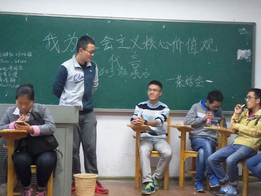 然后,化工1603班的三位同学分别拿上自己的“代言稿”,为全班同学分享了自己对社会主义核心价值观的看法。其中孙鸣昊同学介绍了毛泽东思想、邓小平理论、“三个代表”重要思想,科学发展观以及习近平总书记的“四个全面”战略思想,从而引出社会主义核心价值观及其主要含义,让同学们对社会主义核心价值观有了一定程度的理解。最后指出弘扬社会主义核心价值观的重要意义:弘扬核心价值观是实现中华民族伟大复兴的重要举措,是实现国家长治久安的重要保障。而徐珲同学则更加感性,她认为:“我们身为祖国的花朵、民族的未来,应该以身作则,树立伟大理想,为大学做好规划,争做咱化工院的创新人才,切实去实践核心价值观”。同学们听后若有所思,感受到社会主义核心价值观就在每个人身边。李鑫同学则着重强调了社会主义核心价值观对于民族精神的意义,以幽默风趣的话语调动了班级气氛。