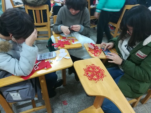 剪纸是一项历史悠久,非常普及的一种民间艺术形式,是中国传统文化之一,也是中国迎接新年的重要活动之一。李商隐之诗“镂金作胜传荆俗,翦彩为人起晋风”即是赞美剪纸。应化一班同学们积极主动地进行各项准备工作,并迫不及待的展开了活动。为确保活动的顺利进行,班长郭淅和团支书将同学以宿舍分组,分组比赛,最终剪得最好的一组将会获得精心准备的礼品。比赛开始,班长向同学们分发红纸,参赛的同学们迫不及待地开始剪了起来。他们手中握着剪刀,仔仔细细认认真真的对照着视频一步一步的剪下去。有的同学之前没有进行过剪纸,忙的晕头转向却又津津有味地学习着剪纸的技巧;有的同学之前练习过剪纸,熟练兴奋地边与同学分享经验边享受剪纸的过程。伴随着视频中欢喜热烈的背景音乐,同学们相互指导、切磋。活动现场气氛融洽,在热烈的氛围中,同学们交流经验,体会传统文化的魅力。