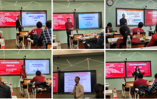 随后,李继山教授代表教育部课程思政示范课程分析化学(1)教学团队,介绍了“分析化学(1)教课程思政融入与经验分享”。羊小海教授则“从古诗的意境美看课程思政元素与专业教学的融合”,以多个实际案例来介绍分析化学(2)的教学中如何润物无声地融入思政育人元素。游常军教授以“登高必自卑 行远必自迩——浅谈《波谱分析》课程思政”为题,介绍了课程特色思政元素的发掘、教学实践和考核评价等内容。分析化学实验负责人李昆教授介绍了“具有实践特色的课程思政融入——分析化学实验教学改革规划”,提出理论与实验教学联动,搭建基础实验与科研训练的桥梁,提升员工实践创新能力,培育人文科学素养的改革规划。之后,刘剑波副教授做了题为“环境科学的历史性和时代性特征——浅谈《环境化学》思政课程建设”的报告,介绍如何以环境问题的历史演变为思路,与环境科学的当代问题相结合,格物致知探究环境化学本质。