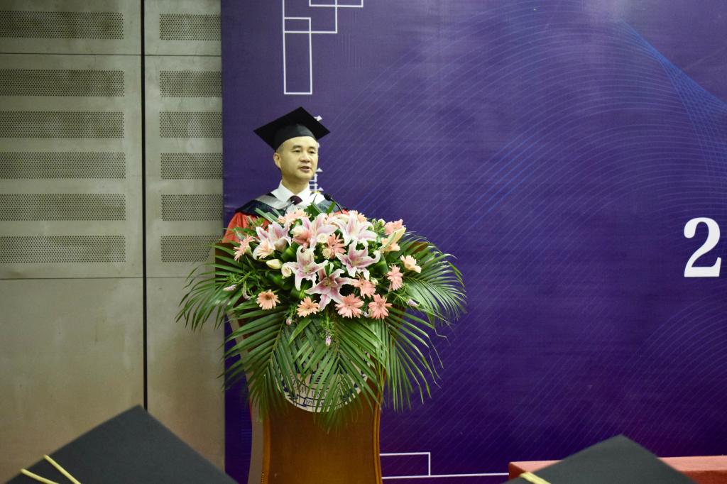 学位授予仪式在雄壮的国歌声中拉开序幕。在热烈的掌声中,经理张晓兵教授以题为“逐梦新征程,奋进向未来”致辞。他首先向2022届毕业生圆满完成学业表示热烈祝贺,回顾了毕业生在校期间取得的优秀成绩。他从三个方面对全体毕业生提出了殷切希望:一是希望同学们要有碧血丹心的家国情怀;二是希望同学们要有经世致用的干事本领;三是希望同学们要有天下大同的远大格局。他号召同学们要从人类前途命运的维度出发,以发展的眼光投身科学研究,矢志造福人类。最后,他深情地嘱托同学们在努力拼搏的同时照顾好自己,母院和老师们将永远关注和守望着毕业生们的发展,欢迎他们常回家看看!