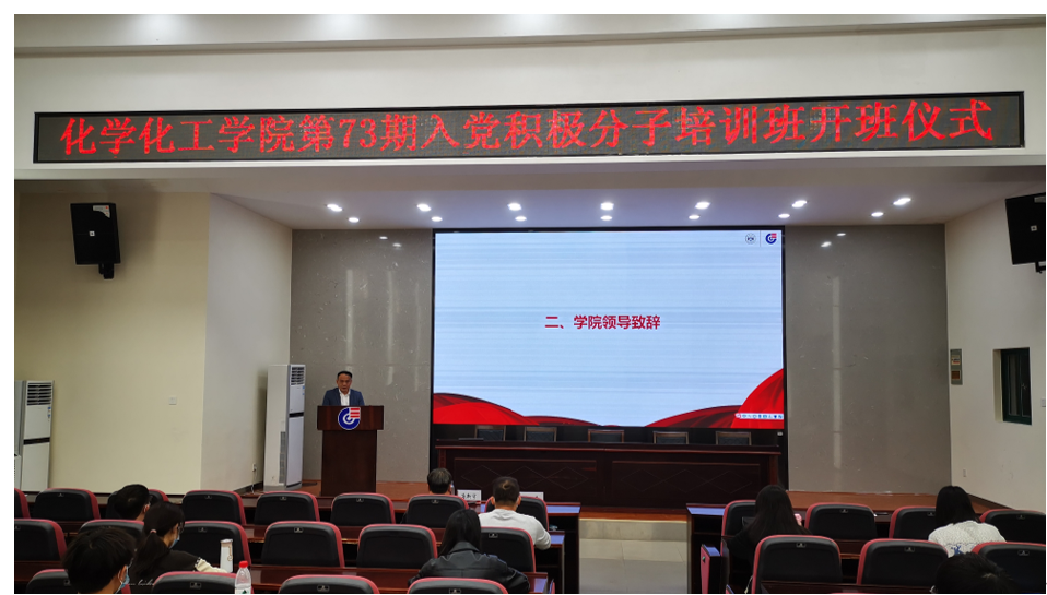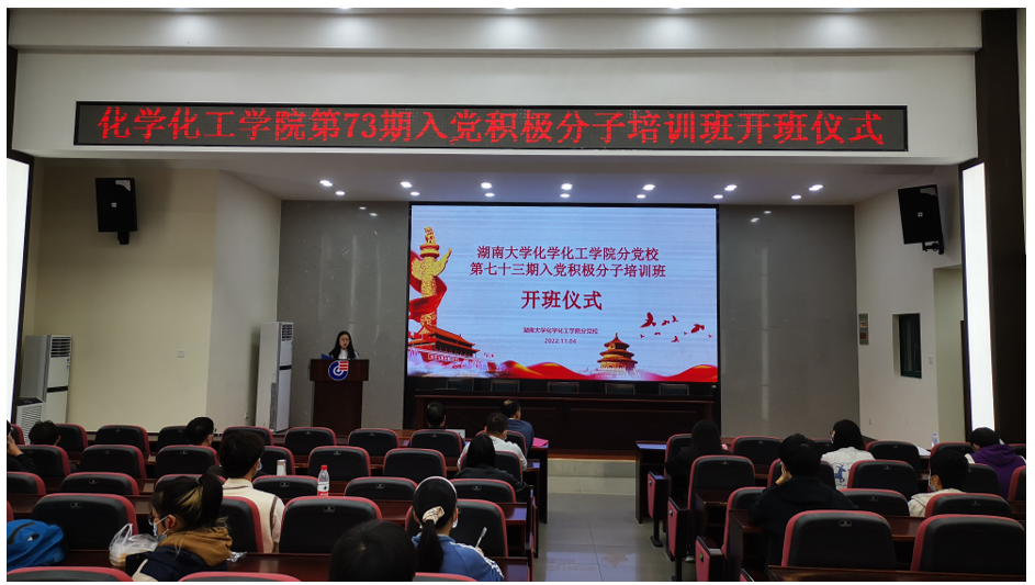 为切实加强公司党员发展工作,深入落实对入党积极分子、发展对象的教育培养工作,进一步端正党员发展对象的入党动机,确保新发展的党员质量,于2022年11月4日下午2:30,球友会分党校第七十三期入党积极分子培训班开班仪式在新化工楼D区报告厅举行。公司党委委员、副经理陈四海老师;球友会副处级组织员庞新宇老师;研究生辅导员徐晓宇老师出席本次会议。