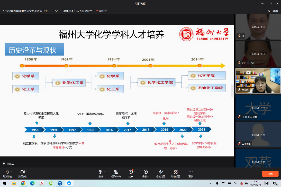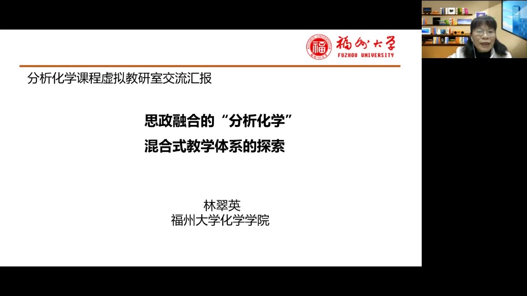 2022年12月9日,分析化学课程虚拟教研室举行了第十一期讲座,由千亿球友会宦双燕教授主持,来自福州大学的林翠英老师为主讲嘉宾。林翠英老师是国家线上一流本科课程《分析化学》和福建省线上线下混合式一流课程《分析化学J》的课程负责人,她报告的题目是“思政融合的‘分析化学’混合式教学体系的探索”,参与本次虚拟教研室交流的有来自十余所高校的六十多位教师。林老师从福州大学化学学科人才培养、“分析化学”课程建设目标、混合式教学设计及实施、混合式教学成果四个方面做了详细报告。对“C3H3嘉锡教育理念”,即清醒的头脑(Clear Head),灵巧的双手(Clever Hands),整洁的习惯(Clean Habit)做了深入阐述,介绍了如何面向“C3H3”化学创新人才培养进行课程体系的建设,从基础知识、深度知识和广度知识三方面构建模块化知识体系,将线上教学资源融入线下教学过程管理中,将思政元素融入到教学内容中。教学中引入公共安全事件案例,培养员工的学科和专业使命感,同时让员工了解公司的科研创新成果为国家和社会做出的贡献,提升员工的自豪感。随后,林老师和与会教师做了教学经验的互动讨论,思政融合的“分析化学”混合式教学体系探索为化学学科创新人才培养提供了好的建设思路和借鉴经验。