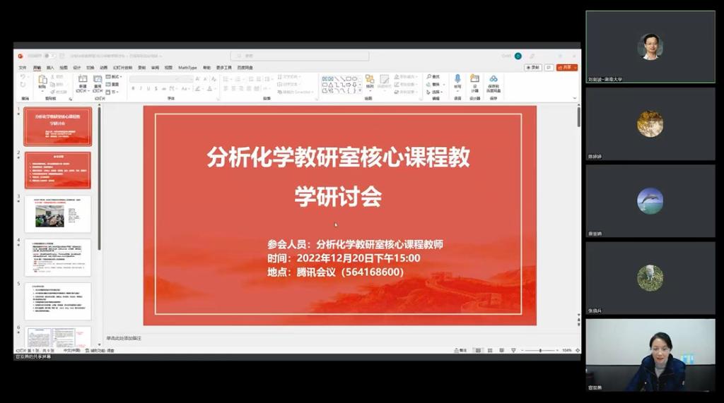 为了提高本科生培养质量,贯彻落实公司召开的 “院-系-课程” 三级联动构建全链条人才培养新格局会议精神,2022年12月20日下午,分析化学教研室采取腾讯会议线上模式召开核心课程教学研讨会,针对分析化学系列课程及实验教学中存在的问题,充分研讨如何从教学过程中各个部分严格管理,来有效提高本科教学质量,落实立德树人根本任务。研讨会由分析化学课程负责人宦双燕老师主持。担任分析化学(1)、(2)、波谱分析和分析化学实验等相关课程教学的31位教师参会。
