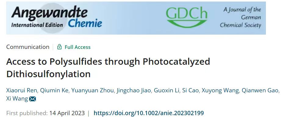 近日,公司王兮教授团队利用光致氧化还原策略实现了多种不饱和烃和张力环烷烃的连二硫磺酰化反应,并发明了一种新型亲核连二硫化试剂,实现了多种亲电试剂的亲核连二硫化反应。这种新试剂可以利用苯乙烯的连二硫磺酰化反应高效制备。相关成果以“Access to Polysulfides through Photocatalyzed Dithiosulfonylation”为题发表在国际高水平期刊德国应用化学《Angewandte Chemie International Edition》上。