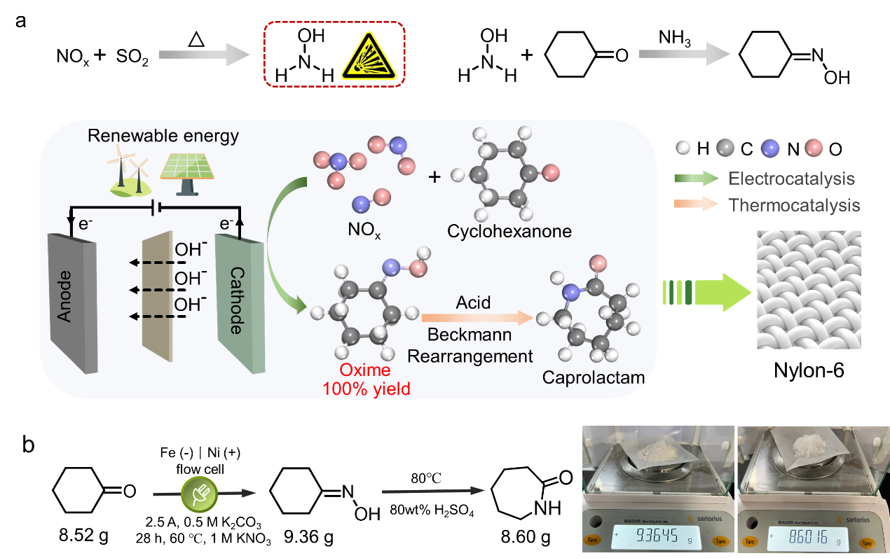 近日,千亿球友会王双印教授团队提出了一种使用氮氧化物和环己酮直接电合成环己酮肟的方法,收率接近100%,避免了使用高浓度羟胺溶液,展示了一种简单的绿色生产尼龙6前驱体的策略。