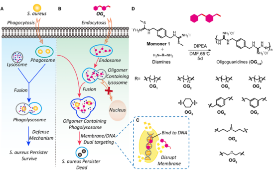 为了解决这一问题,冯欣欣副教授团队提出了一种策略,即精确定位金黄色葡萄球菌泡囊,以根除这些持久存活的细菌。因此,该团队设计并合成了一种具有双重抗菌机制的寡聚胍类抗菌肽模拟物,用于精确定位和根除吞噬体溶酶体腔中的金黄色葡萄球菌。这项研究不仅证实了这种策略可以最小化这种抗菌模拟物与其他细胞器的相互作用,从而提高了其生物相容性,还从化员工物学角度揭示了抗菌化合物的精确定位在提升细胞内抗菌效力上的重要性,为未来的细胞内杀菌系统开发提供了理论基础。