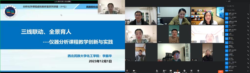 12月1日,分析化学课程虚拟教研室举行了第十七期讲座,由宦双燕教授主持,西北民族大学化工公司李振华副教授“三线联动、全景育人--仪器分析课程教学创新与实践”为题,给与会老师带来精彩的报告。分析化学课程虚拟教研室和化学类专业基础理论课程虚拟教研室的七十余位教师通过线上会议和观看直播的方式参与了本次讲座。会议录播视频还将共享到民族院校应用化学专业虚拟教研室。