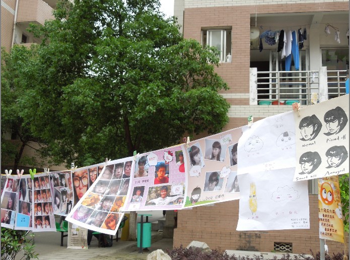在明媚的阳光,一张张承载着趣味表情的照片在微风中摇曳摆动,它们或是搞怪可爱、或是卖萌傻气,无一不展现了青春的活力与精彩。同学们纷纷被吸引过来,站在照片前细致地欣赏,时不时一阵欢笑。在篮球场的这一角,悬挂着的照片就像一道亮丽的风景,用丰富的表情和色彩点燃了大公司园的活泼与精彩。