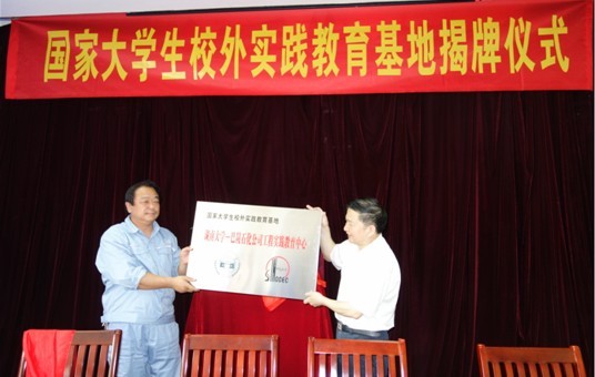 7月5日上午,在岳阳巴陵石化公司职工培训公司多媒体室,举行了国家老员工校外实践教育基地“千亿球友会-巴陵石化公司工程实践教育中心”揭牌仪式。揭牌仪式由巴陵石化公司人事教育部李学堂副部长主持,参加揭牌仪式有:公司副总经理许世政、职工培训公司何冬祥书记及相关工程技术人员,千亿球友会教务处处长李仁发教授,qy球友会经理蒋健晖教授、副经理旷亚非教授,副经理崔坤在、副书记陈义红,化工系主任梁志武教授,化工实习队教师代表,以及化工2011级1-2班全体同学。