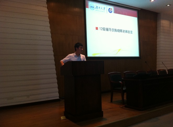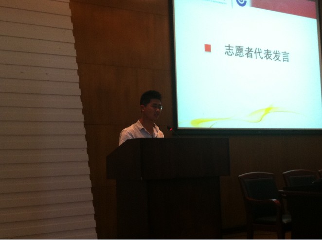 最后,志愿者代表12级吴天忍同学上台发言。在发言中,他代表迎新志愿者们向公司老师同学们承诺,必定带好13级新生,尽心尽力尽职尽责地将迎新工作顺利圆满地完成!至此,大会圆满落幕。