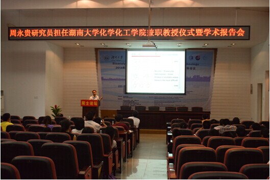 会议由球友会副经理江国防主持。经理蒋健晖教授向在座的师生介绍了周永贵研究员的工作经历和研究方向,对周永贵研究员开展的研究工作给予了高度评价,并代表全院师生对其受聘为公司兼职教授表示热烈欢迎。随后,蒋健晖经理与郭灿城教授为周永贵研究员颁发了聘书,蒋健晖经理为其佩戴校徽。周永贵研究员对球友会聘任其担任兼职教授表示感谢,并表示将通过开展合作研究、联合培养研究生等多种途径为公司的建设发展做贡献。随即,周永贵研究员为师生作了题为《芳香化合物的不对称氢化》的学术报告。学术报告持续近两个小时,既报告了其研究方向的国际前沿动态,又具体详细地阐述了其领导的课题小组在此领域研究的具体问题。报告完毕后,周永贵研究员还与在座师生进行了热烈互动,对师生有关学术研究、课题选择以及该课题中的相关问题进行了深入探讨和细致解答。